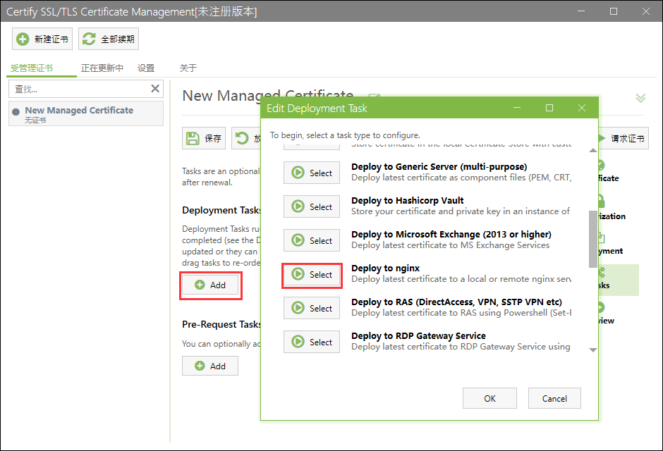 caddy有模块可以轻松调用各种dns服务器api来自动申请证书,不过使用nginx这样的web服务器或者是其他需要tls处理的程序,可能会去搜索通配符证书的申请,如果用得是windows server,搜索通配符证书会有各种linux的教程,而搜windows则会有用linux子系统、手动添加dns记录这些很不方便的操作,既然linux能做到调用api来修改dns,windows肯定也能做到,我都用windows server了肯定更希望用图形图面来管理,尤其是我还很喜欢迁移服务器,好在我找到了Certify,这是个在windows平台图形化管理自动申请证书的程序,只需要配置一次就可以在每次到期前自动重新申请,下载地址,安装过程就一直下一步没什么好说的,第一次用会看到一个这样的界面,点击新建证书。