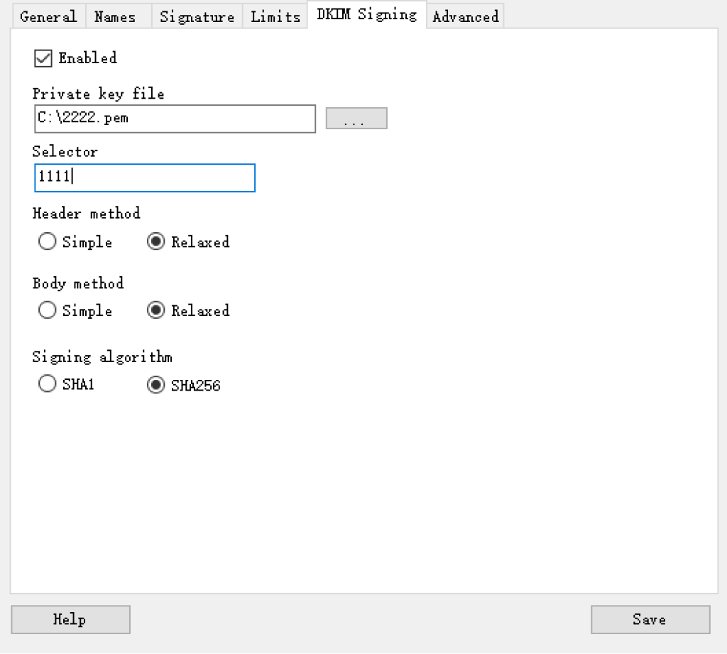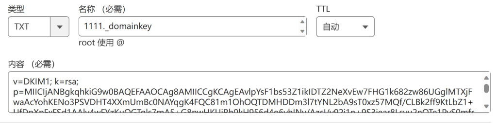 其中必须设置的是dkim signing,如果不设置基本会被认为是垃圾邮件甚至不会接收,可以随意寻找一个可信任生成dkim的网站,在网站上输入domin和selector,selector被用来寻找dns记录,生成后将私钥保存到一个文本文件里,公钥保存到txt记录里,比如selector是1111,TXT记录就是这样的