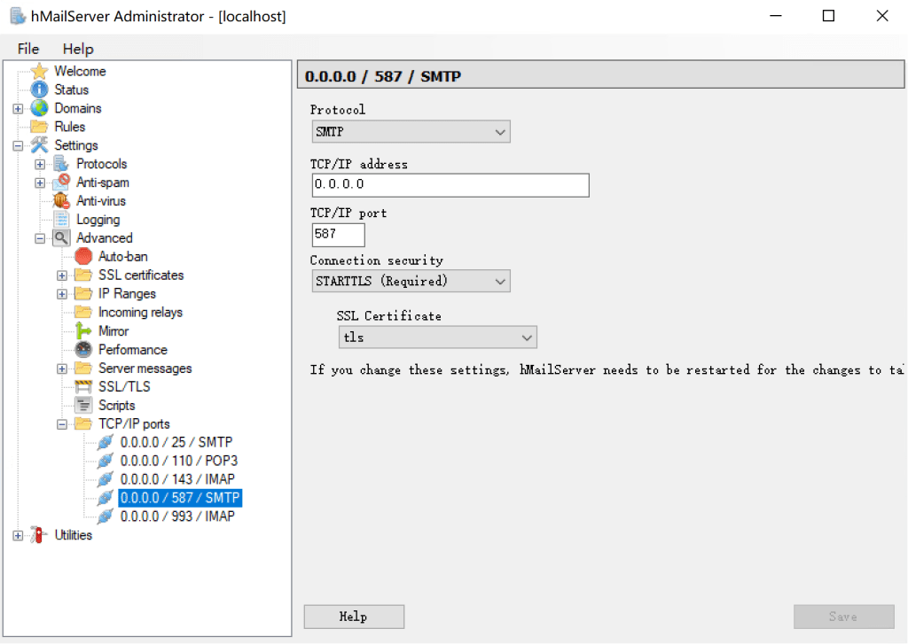 端口设置里把587设置为starttls并选一个证书,一般邮箱客户端强制要有一个收件协议,所以把143端口也设为starttls并选择证书