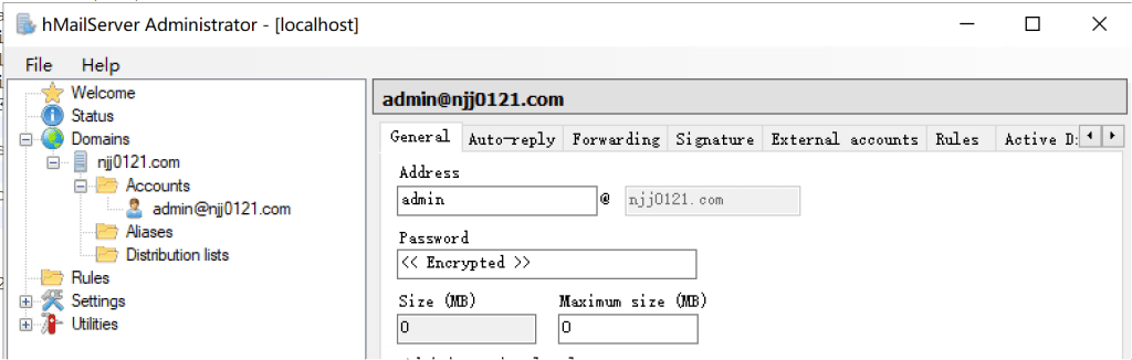 然后在域名下的accounts点击add添加连接账户,输入用户名和密码点save就添加成功了